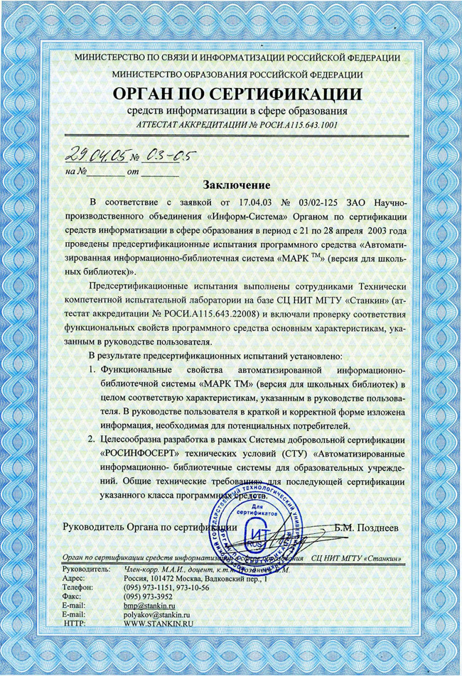 Заключение о сертификации АИБС "МАРК–SQL: версия для школьных библиотек"